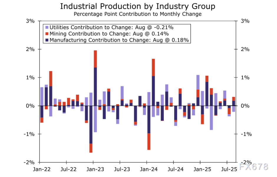 公用事业产出是主要疲软来源,继7月下滑0.7%后,上月又下降2.0%。尽管矿业生产增长了0.9%,但这一增幅不足以抵消7月的跌幅。