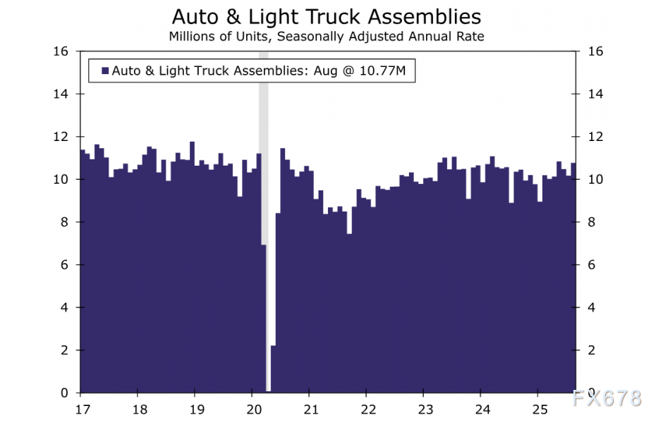 一年前,机动车及零部件制造和杂项制造业的活动也均有所回升,其中汽车制造业现已实现增长。过去连续九个月中,汽车行业活跃度均超过疫情前平均水平,但略低于2023-2024年期间的平均水平。在总装量方面,轿车与轻型卡车目前正朝着过去三年记录区间的高端迈进。